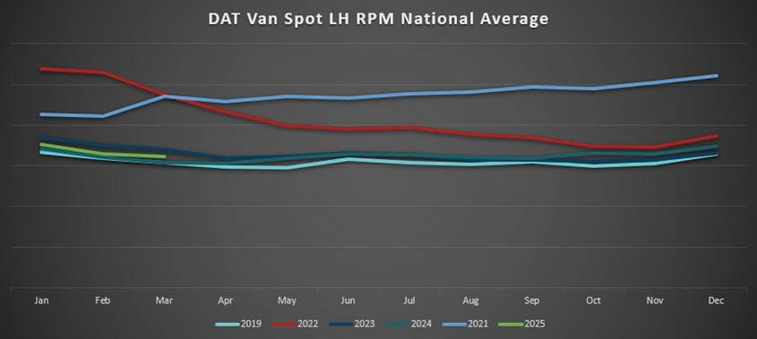 DAT'sNationalVanSpotLinehaulRPMrose4%year-over-yearinMarch,buttheimpactoflowerdieselprices offsetthosegains,leavingall-inRPMflatcomparedtothesameperiodlastyear.Barringmajordisruptions,rates areexpectedtofollow2024seasonalpatterns,climbinginMayandholdingslightlyelevatedlevelsthroughJuly.