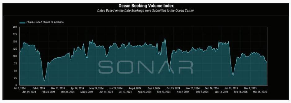 AccordingtoContainerAtlasdata,dailyoceancontainerbookingsfromChinatotheU.S.reachedtheirpeakon March19buthavesincefallenbyabout31%.Thisdeclineunderscorestheimmediat eimpactofthenewtariffson near-termvolumes.