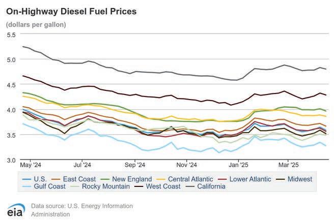 TheU.S.nationalaveragecost pergallonforonhighway dieselinthemonthofMarch 2025cameinat$3.585,which is$.9or2.4%lowerthan February2025averageof $3.675.TheU.S.national averageinMarchof2024was $4.022,whichis$.44or10.9% morethanMarch2025.We startthesecondweekofApril 2025offat$3.579pergallon fortheU.S.nationalaverage.