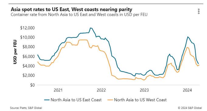 Demand: East Coast demand craters as shippers divert more toward West Coast ports. Slight increases forecasted for the rest of the year.