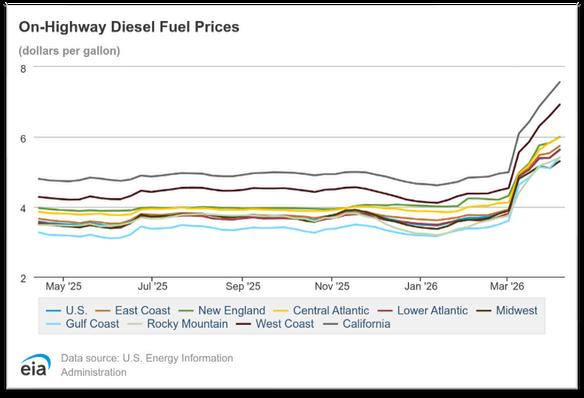 A little over a year after “Liberation Day,” energy costs and anticipatory implications of the war in Iran have not slowed rising spot rates or momentum for the balance of the year outlook. Diesel prices were at a stall in progress more than a shift in direction, but despite bright spots, there are no significant demand signals indicating any surges in volume. Capacity continues to tighten with challenges regionally tied to regulatory and inspection activity (i.e., California, Arizona and Texas) while rates climb in parallel. Core capital goods orders were up 5% YoY in March, with consumer spending remaining flat.
