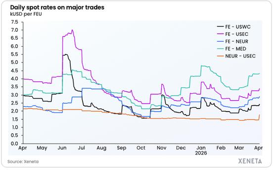 Spot rates from Rotterdam to New York also jumped 25% to $1,968 per FEU in the first week of April, breaking the usual trend of stability in the Transatlantic trade. The primary driver was the limited capacity due to vessel schedule issues with Middle East transits.