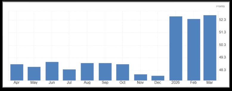 The ISM Manufacturing PMI rose to 52.7 in March 2026, marking the strongest expansion since August 2022 and extending the sector’s growth trend. Gains were driven by accelerating production, while new orders cooled and employment declined slightly further. Cost pressure remains the headline, with the prices index jumping to its highest level since mid-2022 Supplier delays extended for a fourth straight month, signaling continued strain across supply chains. Survey feedback turned more cautious, with a majority of respondents citing geopolitical risk and tariff uncertainty as growing concerns, adding pressure despite the recent momentum in output.