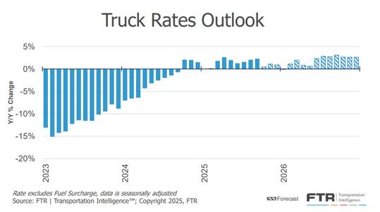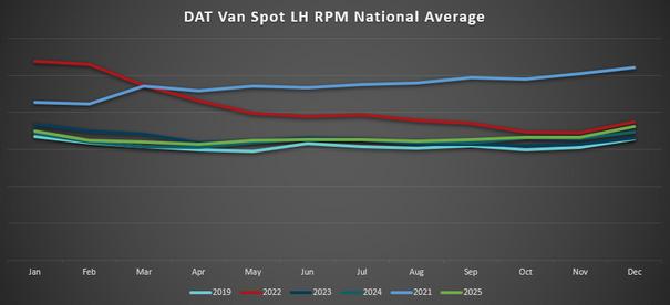 DAT's National Van Spot Linehal RPM shows an increase of 1 9% YoY, excluding fuel surcharges. The modest increases can be in part attributed to seasonal trends and regional peak demand. Early forecasts show a 2.7% increase for 2026.
