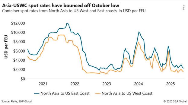 Despite this recent uptick, rates on both the West and East Coast routes remain significantly lower (20-32%) compared to a month ago, primarily due to an ongoing oversupply of shipping capacity relative to lower demand.