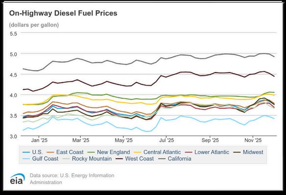 The U S national average cost per gallon for on-highway diesel in November 2025 came in at roughly $3.82, which is $0.048 (1.3%) higher than October’s average of about $3.772. November 2024’s average was approximately $3 897 (noting a prior downward trend), putting November 2025 at about $0.077 (2.0%) lower year-over-year. As of the first week of December 2025 (week ending December 1, 2025), the national average stands at $3.758 per gallon, a decrease of $0 062 (1 6%) from the end of November.