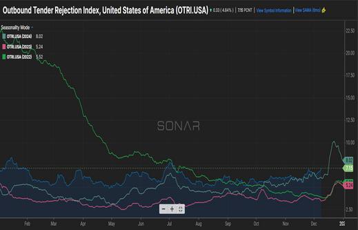The Outbound Tender Rejection Index (OTRI) rose modestly to approximately 7% in line with seasonality Though some markets experienced tightness through the holiday, metrics continue to reflect adequate capacity and favorable conditions for shippers through the end of the year. Seasonal volatility should be expected but muted given available capacity.
