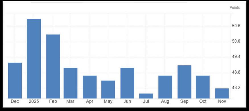 The ISM Manufacturing PMI slipped to 48.2 in November 2025, the weakest reading in four months and the ninth consecutive month of contraction. The downturn was driven by sharper declines in supplier deliveries, new orders and employment, with roughly two-thirds of manufacturers still managing headcount reductions rather than hiring Price pressures intensified slightly, and order backlogs shrank further, highlighting persistent demand softness. Offsetting some weakness, production returned to growth and inventory drawdowns eased.