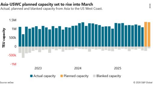 According to data from eeSea, carriers had 1.19 million TEUs of actual capacity on the Asia-West Coast trade lane in January, with that expected to rise to 1.26 million TEUs in February and 1.4 million TEUs in March.