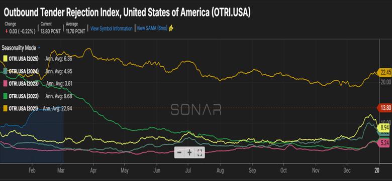 The uncertainty surrounding geopolitical events meets a market with tender rejections still hovering between 1314%. Fuel will be the driving factor in the coming weeks as the reality of the cost per barrel hits diesel prices at the pump. This raises concerns for smaller fleets not as well equipped to weather sustained volatility and adds to the factors shifting momentum to carriers when it comes to pricing.
