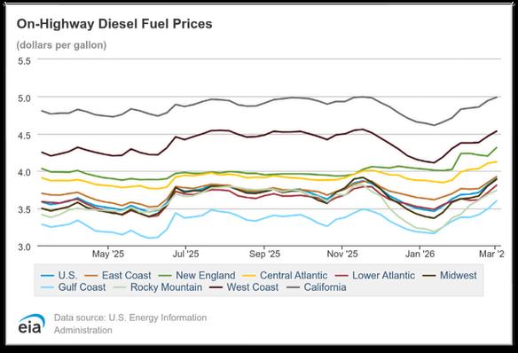 The U S national average cost per gallon for on-highway diesel in February 2026 came in at approximately $3 73, which is $0 21 (6.0%) higher than January 2026’s average of roughly $3.52. February 2025’s average was approximately $3.92, putting February 2026 at about $0.19 (4.8%) lower year-overyear. As of the first week of March 2026 (week ending March 2, 2026), the national average stands at $3.74 per gallon, reflecting a slight increase of about $0.01 (0.3%) from the February monthly average