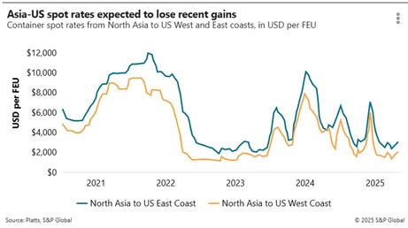 Spot rates for Trans-Pacific containers to the U.S. West Coast jumped $800-$1,000 per FEU to $2,962 per FEU in the first week of November to levels not seen since July of this year But analysts are already reporting that carriers are quietly offering much lower rates amid weak demand and little hope for continued volume increases Rates from Asia to the U.S. East Coast have already fallen about $100300 per FEU in the second week of November.