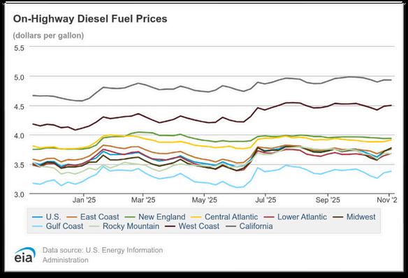 The U S national average cost per gallon for on-highway diesel in October 2025 is estimated at $3.772, which is $0.028 (0.7%) higher than September’s average of roughly $3.745. October 2024’s average was approximately $3 691, putting October 2025 at about $0.081 (2.2%) higher year-overyear. As of the first week of November 2025 (week ending November 3, 2025), the national average stands at $3.79 per gallon, which is $0.018 (0.5%) higher than the end of October