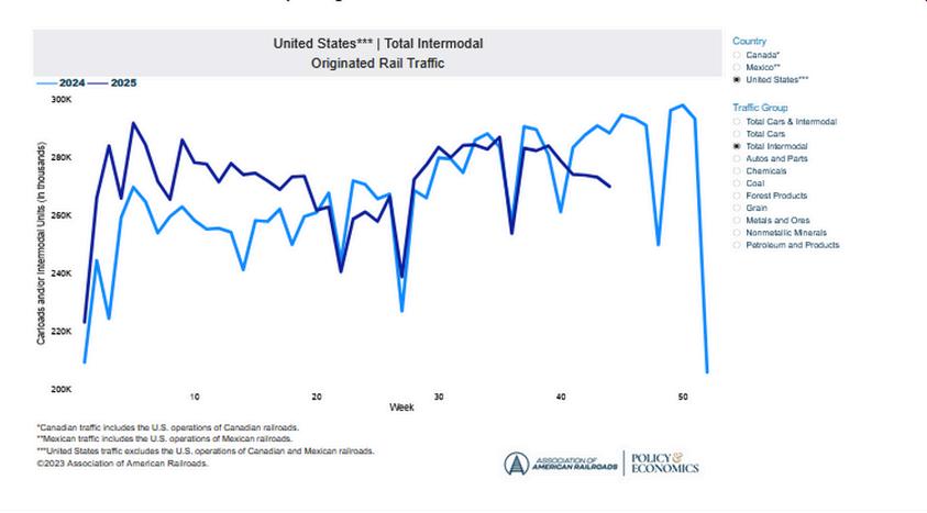 Overall, Intermodal volumes for U S -based carriers are decreasing compared to 2024 due to high unseasonable volumes last year The negative volume comparison is expected to continue into early 2026