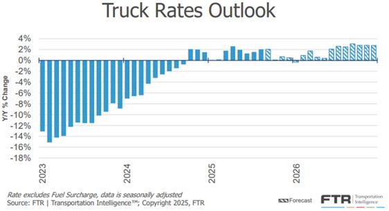 FTR Intelligence continues to forecast a stable market environment through the remainder of 2025 and into 2026. Linehaul rate growth remains projected at a modest pace, with fuel surcharge trends gradually reversing earlier declines. The combination of these factors suggests all-in RPM levels may continue to show slight year-overyear gains in the near term; however, broader market conditions remain shipper friendly. Fatal accidents involving non-English proficient drivers have intensified regulatory enforcement of language requirements, but measurable effects on capacity or pricing have not yet materialized a significant impact on overall capacity to drive a large rate shift.