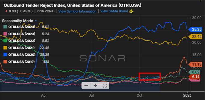 The Outbound Tender Rejection Index (OTRI) remained stable at approximately 6% throughout October, consistent with the shipper-friendly market conditions that have persisted through most of 2025. These levels continue to reflect adequate carrier capacity and favorable conditions for shippers as the year progresses through Q4. With no significant capacity disruptions on the horizon, the market is expected to maintain this balance through the remainder of the year. Holiday season volatility should remain relatively muted compared to historical bull holiday market conditions.