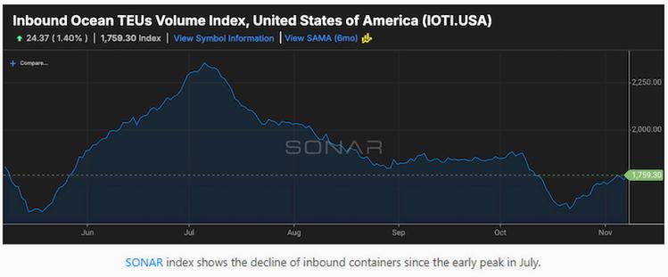 Eastbound rates from Asia to the U.S. West Coast fell below $2000 per FEU in second week of November, according to the Freightos Baltic Index.