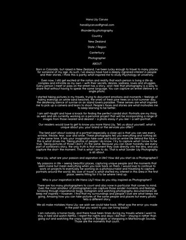 Hana Lily Caruso hanalilycaruso@gmail.com @sonderlily.photography Country New Zealand State / Region Canterbury Photographer ABOUT Born in Colorado, but raised in New Zealand, I've been lucky enough to travel to many places for someone of my age. As such, I've always have had a deeply ingrained interest in people and their stories. I think this is partly what inspired me to study Psychology at university. Even now, I still get excited at the notion and reality that each person is living a life as complex and intricate as my own - with their secrets, desires, sadness, loves and struggles. Every person I meet or pass on the street has a story, and I feel that photography is a way to share that without having to speak the same language. You can capture an entire lifetime in a single photo. I started taking pictures in my travels, trying to document emotions and moments - feelings of balmy evenings on white sand beaches, the smell of fresh pine trees on a hot summer day, the deafening silence of sunrise on an island lovers paradise. These senses are what inspired me to pick up a camera and learn to shoot. People's faces and stories are what motivates me to keep learning to be better. I am self-taught and have a knack for finding the perfect candid shot. Portraits are my thing as well and am currently working on a personal project that will be incorporating a range of images from those nearest and dearest - a photo essay if you like - a self-portrait. Our readers would love to get to know you more Hana Lily. Tell us about yourself, what is unique about you, your brand or the services you offer? The best part about looking at a portrait (especially a close up) is that you can see every wrinkle, freckle, tear, scar and smile. These photographs tell you everything and nothing all at the same time. It lets your imagination take over and build an entire life behind the face this is what drives me. Taking photos of people I do know, I try to capture what I know to be true. Taking pictures of those I don't, it's the same. Because you can never honestly see every part of someone's story, the only truth is that moment they look directly into the lens, and you capture the shot- the moment. That is what I aim to do. That is what Sonder Lily Photography is all about. Hana Lily, what are your passion and aspiration in life? How did you start as a Photographer? My passions in life - seeing beautiful places, capturing unique people and the moments that seem inane but mean everything when you look back on them. I would love to continue to work on projects to eventually be working as a photojournalist and travelling to capture portraits around the world. My love of travel is what started my interest in this area in the first place, seems fitting for it to be where I end up. Who is your inspiration in life Hana Lily? How do you stay inspired as Photographer? There are too many photographers to count and also none in particular that comes to mind. Even the most amateur of photographers can capture those sonder moments and feelings. Scrolling through inspirational blogs, Instagram and watching photography documentaries all keep me inspired - however, I find that my surroundings and people I love are what keeps me going. Amazing how you can take pictures of the same people and places but every photo tells a different story. We all make mistakes Hana Lily; we wish we could take back. What was the error you made in the past that you want to you can bring back? I am naturally a home-body, and there have been times during my travels where I want to stay in bed and watch Netflix. I regret the nights and days I did that - staying in rather than going out and watching the crazy nightlife in Bangkok or stargazing in Marlborough Sounds. Those are the moments that count.
