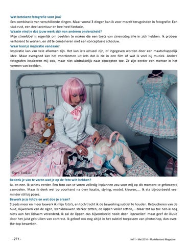 Shiro Tsukiko Bedenk je van te voren wat je op de foto wilt hebben? Ja, en nee. Ik schets eerder. Een foto van te voren volledig inplannen zou voor mij op dit moment te geforceerd aanvoelen. Maar ik denk wel op voorhand na over locatie, styling, model, kleuren,…. Ik sta bijvoorbeeld veel minder stil bij poses. Bewerk je je foto’s en wat doe je eraan? Steeds meer en meer bewerk ik mijn foto s, en toch tracht ik de bewerking subtiel te houden. Retoucheren van de huid, bijwerken van de ogen, wenkbrauwen sterker zetten, de lippen voller zetten,… Maar tot nu toe heb ik nog niets aan het lichaam veranderd. Ik zal de lippen dus bijvoorbeeld nooit doen opzwellen maar geef de illusie door het juist gebruiken van contrast. Ik geloof ook nog altijd in het subtiel toepassen van photoshop, dan overthe-top bewerken. Rene de Haan - 271 -
