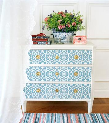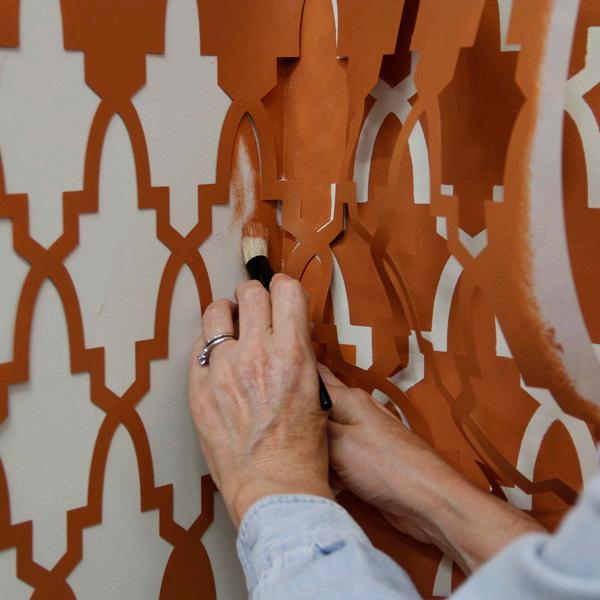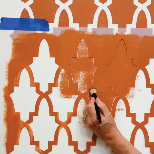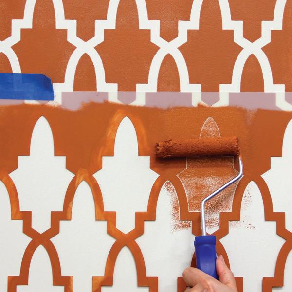You can also use a combination of roller AND brush stenciling. Use the paint roller to apply paint through the stencil quickly and finish off with brush stenciling at the edges for a clean, crisp look.