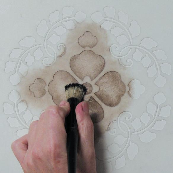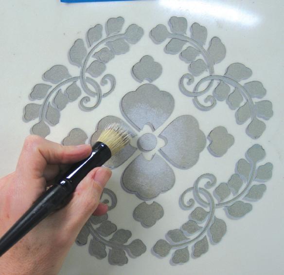 Stippling or “pouncing” is another useful stenciling technique. It provides a way to add additional color or even texture to the look of your stenciling as the pouncing motion creates a more uneven, grainy look.