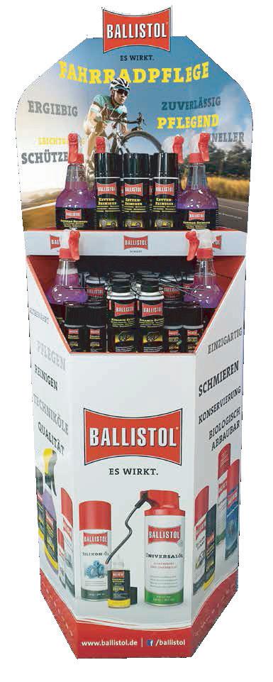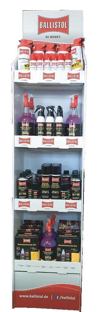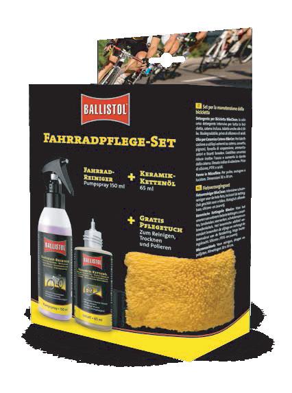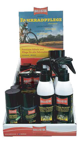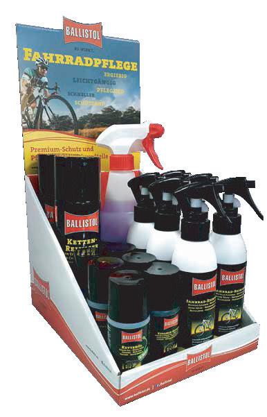Suggerimenti per la composizione: 12x 350 ml Ballistol Olio Universale VarioFlex Spray 12x 50 ml Ballistol Olio Universale Spray 12x 150 ml Detergente per bici 6x 750 ml Detergente per bici 6x 250 ml Spray detergente per catene 6x 65 ml Olio per catene di E-Bike 12x 200 ml Olio ceramico spray 6x 65 ml Olio ceramico 6x Kit-Pulizia bicicletta Disponibile come: UVP netto Art -Nr Taglia