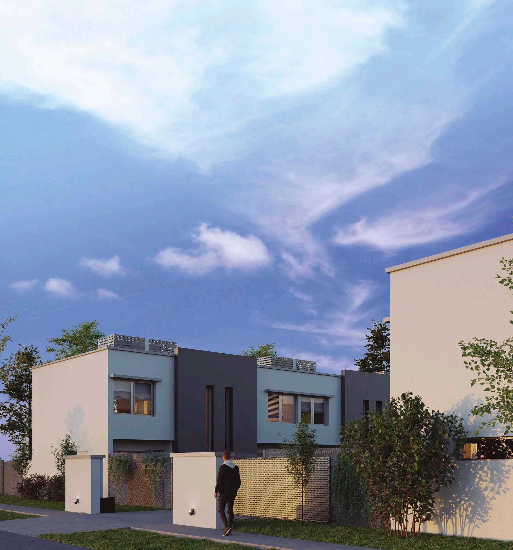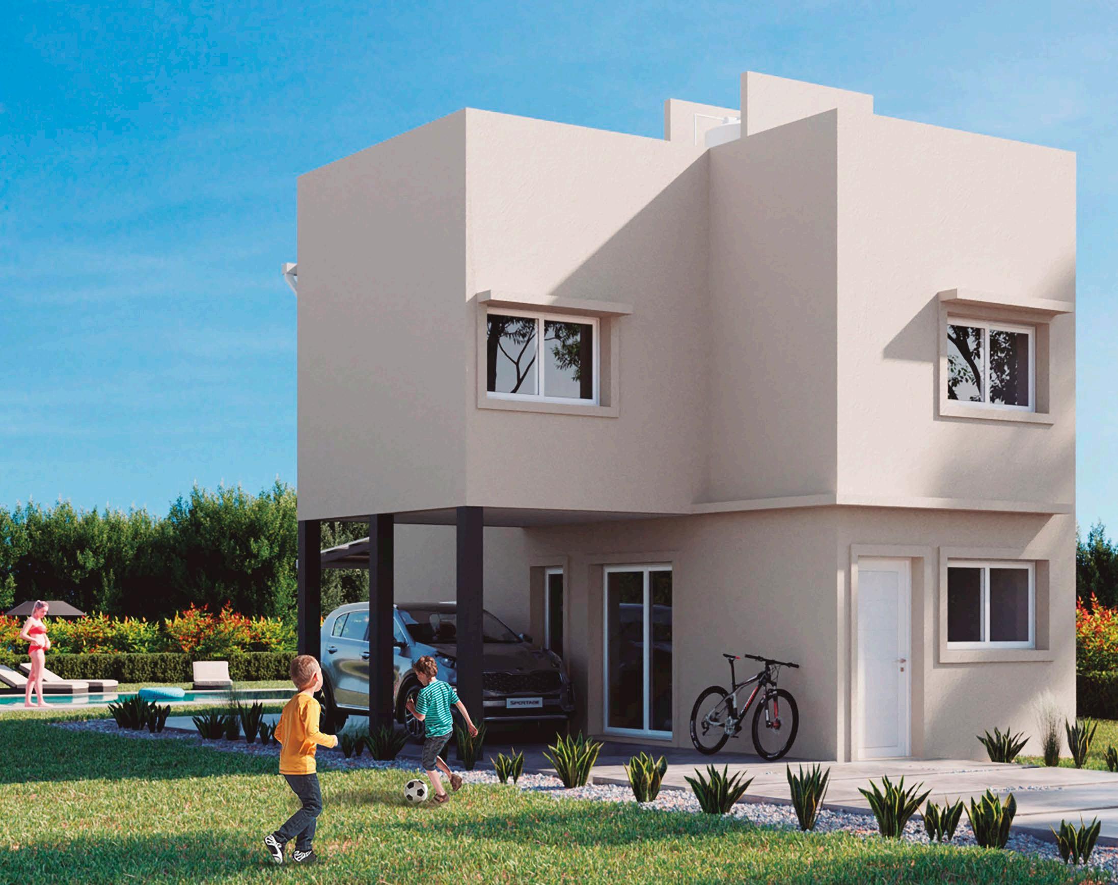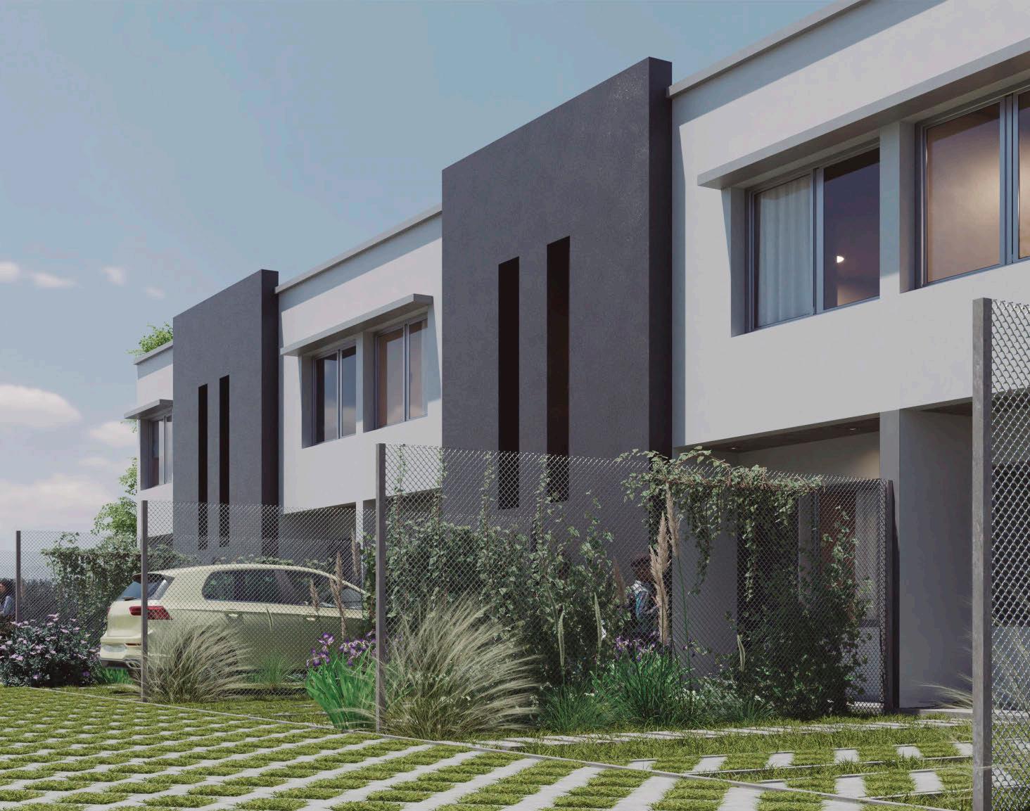Casas en condominio en Paseo del Norte, Funes. Conjuntos de 12 dúplex con ingreso común cerrado con portón. Cochera y jardín individual con piscina y parrillero.