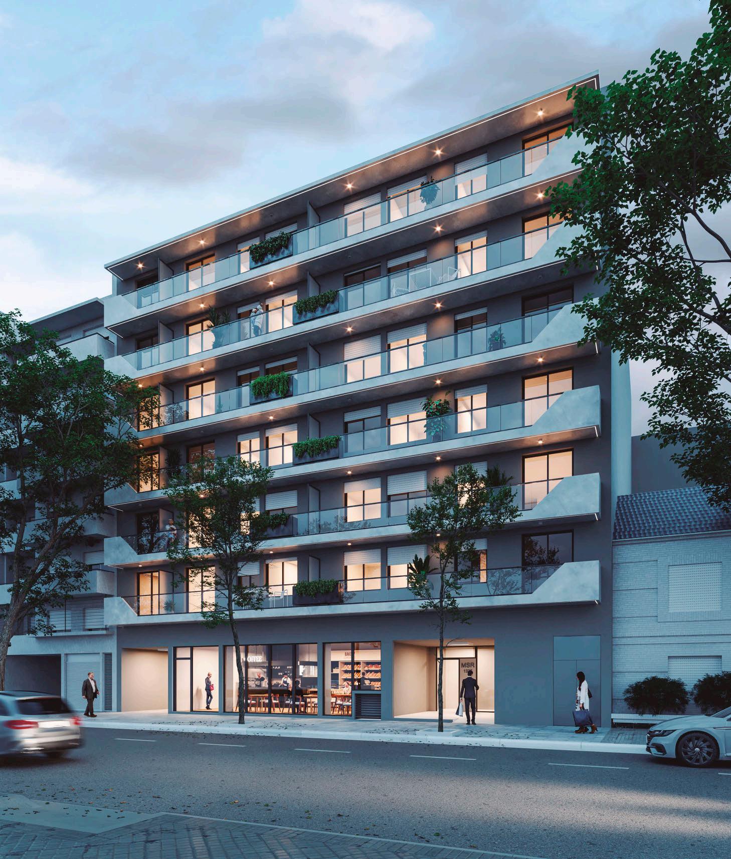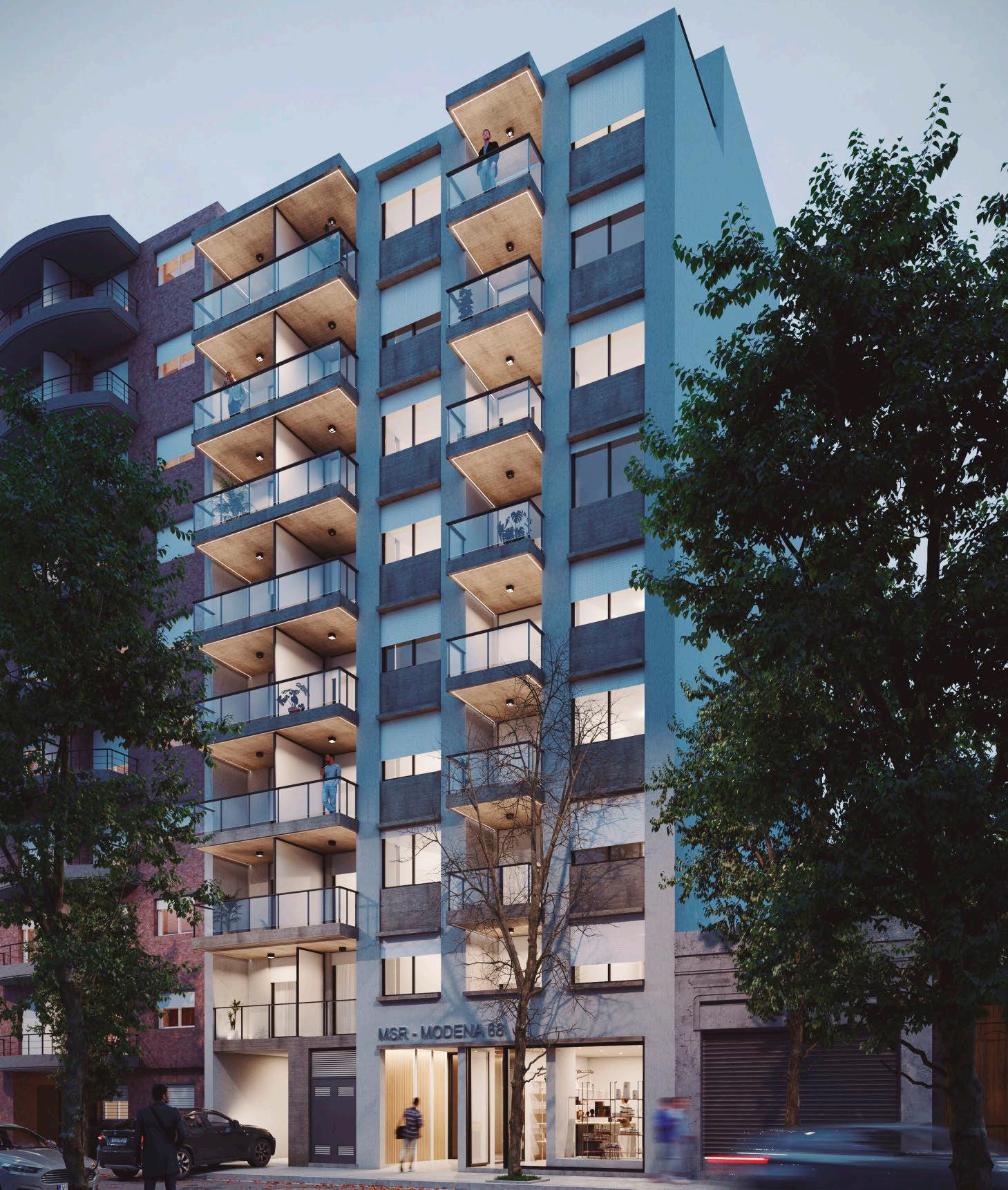 Edificio desarrollado en subsuelo, planta baja, basamento de 3 plantas y 22 pisos. Departamentos de 1, 2 y 3 dormitorios.