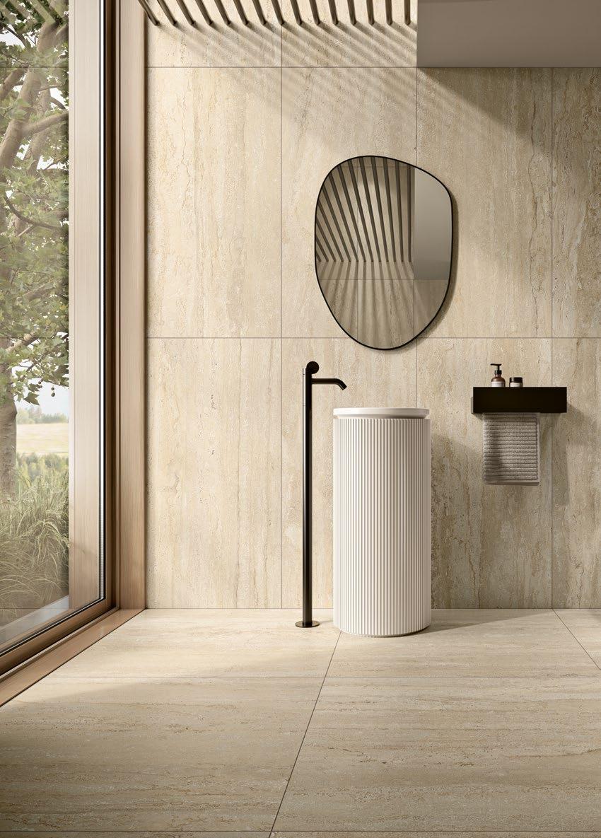 Fliseserie inspirert av travertin, en sedimentær kalkstein fra Italia. Med sin unike tekstur og varme fargetoner, tilfører den et trendy, men tidløst preg på ditt baderom.