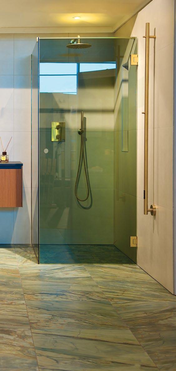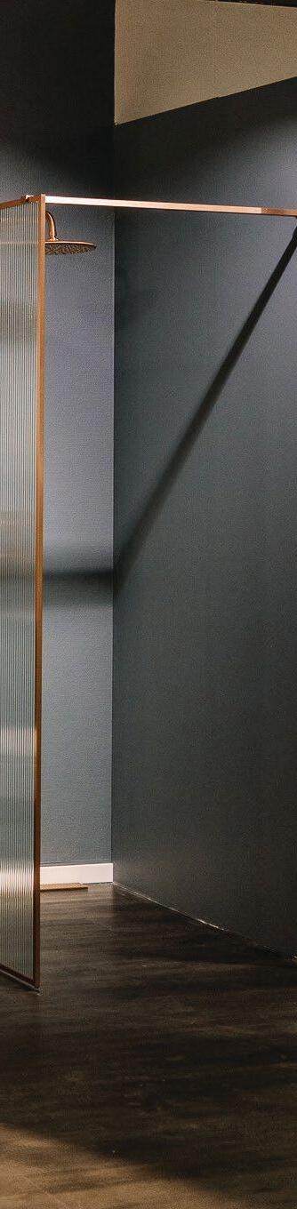 Walk-in dusj med rille-glass og profiler i børstet kobber. Veil. pris 17 589,Nå kun