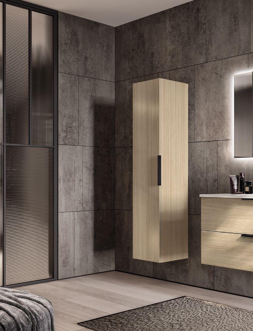 Unik høyskap i samme farge og struktur som servantmøblene. Et romslig skap med 4 glasshyller. Dørene kan hengsles til høyre eller venstre etter behov. Leveres med sort håndtak som standard.