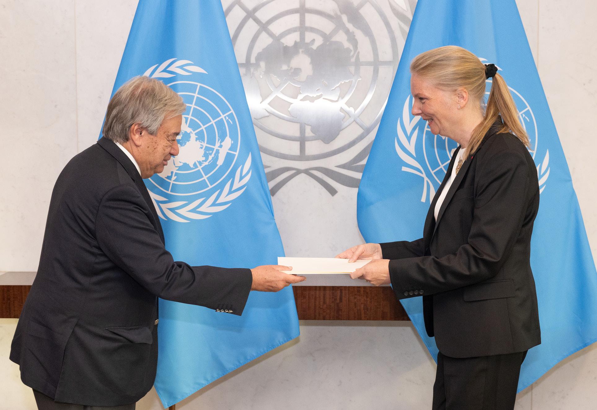 Nicola Clase överlämnar sina kreditivbrev till FNs generalsekreterare António Guterres.