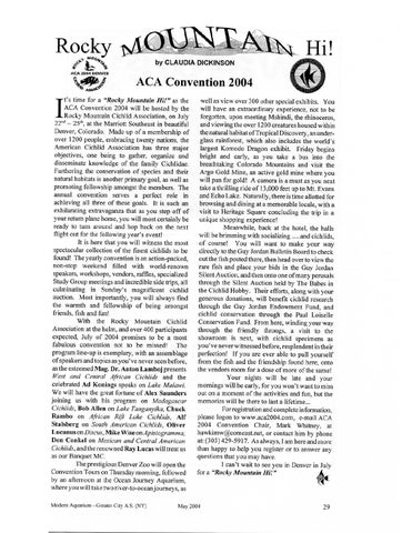 ACA Convention 2004 t's time for a "Rocky Mountain Hi!'9 as the ACA Convention 2004 will be hosted by the Rocky Mountain Cichlid Association, on July 22nd ~ 25th, at the Marriott Southeast in beautiful Denver, Colorado. Made up of a membership of over 1200 people, embracing twenty nations, the American Cichlid Association has three major objectives, one being to gather, organize and disseminate knowledge of the family Cichlidae. Furthering the conservation of species and their natural habitats is another primary goal, as well as promoting fellowship amongst the members. The annual convention serves a perfect role in achieving all three of these goals. It is such an exhilarating extravaganza that as you step off of your return plane home, you will most certainly be ready to turn around and hop back on the next flight out for the following year's event! It is here that you will witness the most spectacular collection of the finest cichlids to be found! The yearly convention is an action-packed, non-stop weekend filled with world-renown speakers, workshops, vendors, raffles, specialized Study Group meetings and incredible side trips, all culminating in Sunday's magnificent cichlid auction. Most importantly, you will always find the warmth and fellowship of being amongst friends, fish and fun! With the Rocky Mountain Cichlid Association at the helm, and over 400 participants expected, July of 2004 promises to be a most fabulous convention not to be missed! The program line-up is exemplary, with an assemblage of speakers and topics as you've never seen before, as the esteemed Mag. Dr. Anton Lamboj presents West and Central African Cichlids and the celebrated Ad Konings speaks on Lake Malawi. We will have the great fortune of Alex Saunders joining us with his program on Madagascar Cichlids, Bob Allen on Lake Tanganyika, Chuck Ram bo on African Rift Lake Cichlids, Alf Stalsberg on South American Cichlids, Oliver Lucanus on Discus, Mike Wise onApistogramma, Don Conkel on Mexican and Central American Cichlids, and the renowned Ray Lucas will treat us as our Banquet MC. The prestigious Denver Zoo will open the Convention Tours on Thursday morning, followed by an afternoon at the Ocean Journey Aquarium, where you will take two river-to-ocean journeys, as