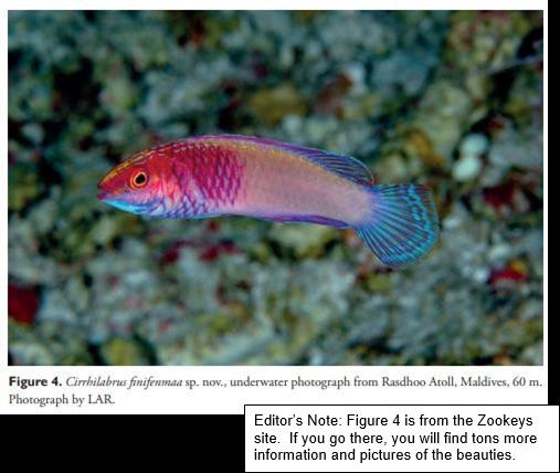 Yi-Kai Tea, Ahmed Najeeb, Joseph Rowlett, Luiz A. Rocha. Cirrhilabrus finifenmaa (Teleostei, Labridae), a new species of fairy wrasse from the Maldives, with comments on the taxonomic identity of C. rubrisquamis and C. wakanda. ZooKeys, 2022; 1088: 65 DOI: 10.3897/ zookeys.1088.78139