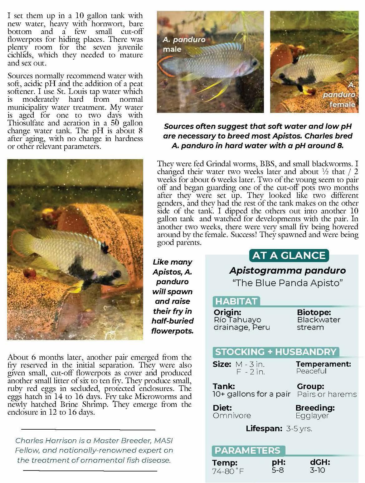 This is followed by a couple of exchange articles―“The Blue Panda Apisto” by Charles Harrison, and “WTFish?: Aquarium Superstitions and Cultural Belief” by Derek P.S. Tustin, whom some of you will likely recall from other exchange articles (Indeed, this is an encore presentation for this article, which first appeared in Modern Aquarium back in 2013.