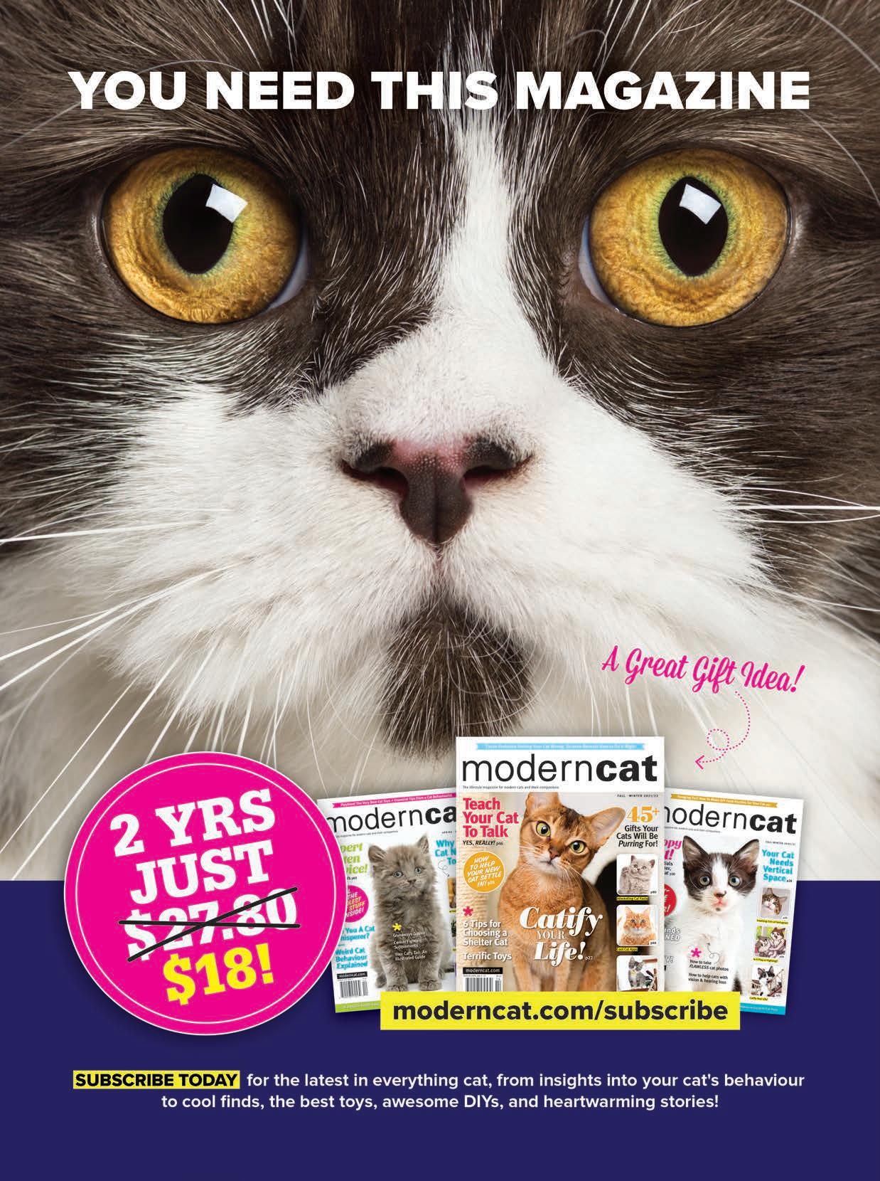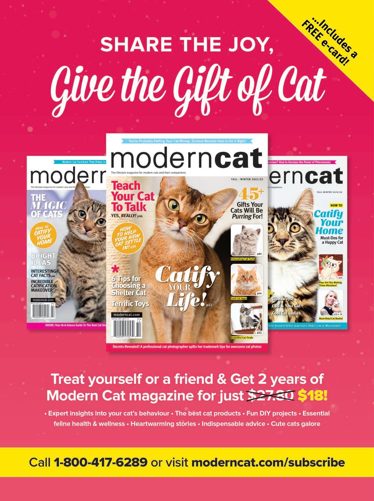 moderncat.com DISPLAY UNTIL JAN 31 ‘23 $6.95 What They Really Think p28 Inside Your Cat’s Mind EXPERT CAT TIPS MULTI-CAT LIFE HACKS Inside: Giveaways Galore! Expert Advice! Behaviour Insights! Heartwarming Stories! The lifestyle magazine for modern cats and their companions cat Celebrating Our Best Friends + The Magic of the Human-Feline Bond! FALL · WINTER 2022/23 p62 p24 p34