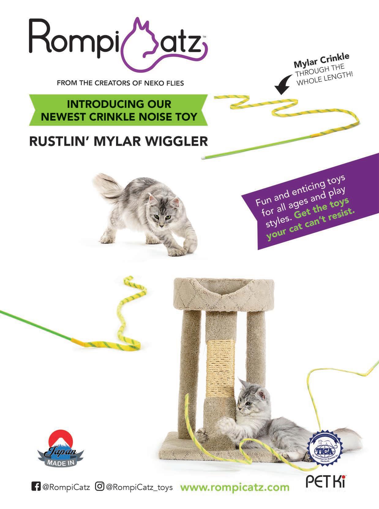 Try the RompiCatz Feather n’ Fabric Teaser wand toy featuring pounce-able soft fabric, feathers on the tip, and a bell for extra enticing play time! (from $10, rompicatz.com)