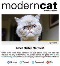 Get published in Modern Cat ! Submit your cat story of no more than 100 words (word count strictly enforced) to tinycatstories@moderncat.com. By submitting you are consenting to publication of your story.