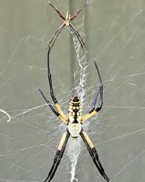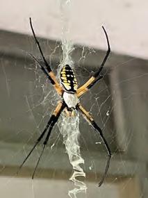 t’s just daylight, and you saunter over to your screen door with coffee in hand to go outside. You go to turn on your sprinklers to prepare for another hot and humid Carolina day. The grass under your feet is warm and dew-covered, and you make your way over to the water spigot, still half-asleep eyes adjusting to the morning sun. As you bend down to turn on the water, out of the corner of your eye you see a web spanning about two feet wide, stretching from your gutter all the way down to a Hollyhock stem. You notice an enormous striking yellow and black spider bouncing in the web about a foot from your face!