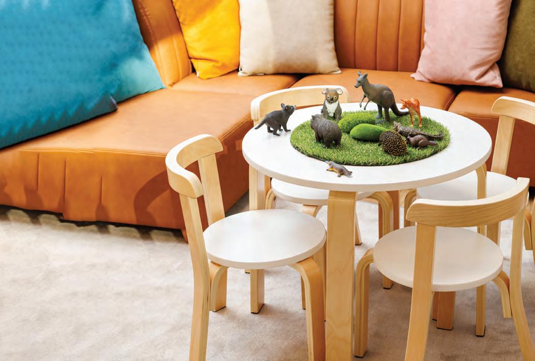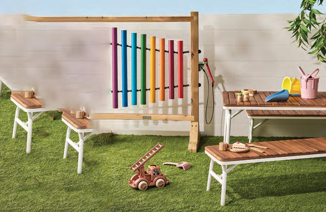 The Outdoor Wicker Table and Benches set is designed for early learning outdoor spaces. Featuring a solid acacia timber tabletop and two benches with natural-coloured plastic wicker, each bench is topped with a charcoal grey seat pad for comfort.