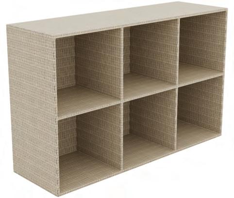 A durable Outdoor Wicker Shelf made with a metal frame and a naturalcoloured plastic wicker. It has 6 large compartments for toys, bags, sports gear, and resources. Measuring 120cm wide x 38cm deep x 76cm high, it comes fully assembled and is suitable for indoor and outdoor use.