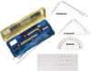 This 10 piece set includes one of each of the following: tin case, compass, divider, set square 45°, set square 60°, ruler 15cm, protractor 180°, pencil, eraser, sharpener and a lettering stencil.