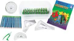 Includes: 20 x 180° Protractors, 10 x 360° Protractors, 10 x Set Squares Pairs, 20 x Compasses, 1 x Pack of 12 HB Writing Pencils, a High Interest Activities in Geometry Book and a Storage Container. Kit contents may vary.