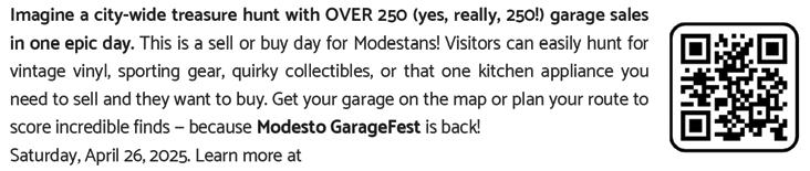 Hop on down to Downtown Modesto on April 4th for BunnyCon 2025. It is a frolicking fun bar hop through downtown Modesto, stopping off at various locally owned bars and restaurants. Get into the spirit and dress up as a bunny, a peep, a carrot, or another Springtime Icon; the group photo will be taken in the 10th Street Plaza at 8:20 p.m. Bring cash for your drinks and tips for the bartenders. It is always free to Hop together and Rock together with Modesto Pub Crawl. More info at @modestopubcrawl on Facebook.
