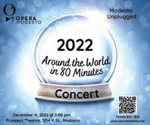 Winter is my favorite season, and world mu sic features some of my favorite sounds: the twang of Chinese string instruments; the haunting harmonies of Eastern European vocal music; the zesty high spirits of a tradi tional Italian folk song. On the first Sunday of this month, there’ll be tastes and traces of all of this and a great deal more, when my annual multicultural concert collaboration with Opera Modesto returns. ‘Around The World In 80 Minutes’ premiered in the win ter of 2019, and this is the third instalment of this vocal variety show featuring young & veteran opera singers sharing traditional songs of their heritage along with chosen favorites. As proud as I am of the range and caliber and prestige of live music I’ve presented over the years, I often feel put to shame by what Opera Modesto does under the creative leadership of Roy & Annalisa, whether it be a full staging of a classic opera or the smaller recital concerts they sprinkle throughout the year. Working with them has led to some of the most rewarding days of my tenure as a concert curator. This year’s program features selections by classical composers; songs in Russian, Italian, Maori and other assorted languages; campfire tunes, Mariachi, and even some John Denver. As a special bonus, the concert also features the return to MU programming of central valley multi-instrumentalist David Perry Molina, who was a featured artist at my World Music Jam series a few years ago. We’re back for the second time at the Prospect Theatre, 1214 K St., on December 4 starting at 2 PM. Tickets for this thrilling afternoon of song are $30 for general, $20 students, available at www.operamodesto. org.