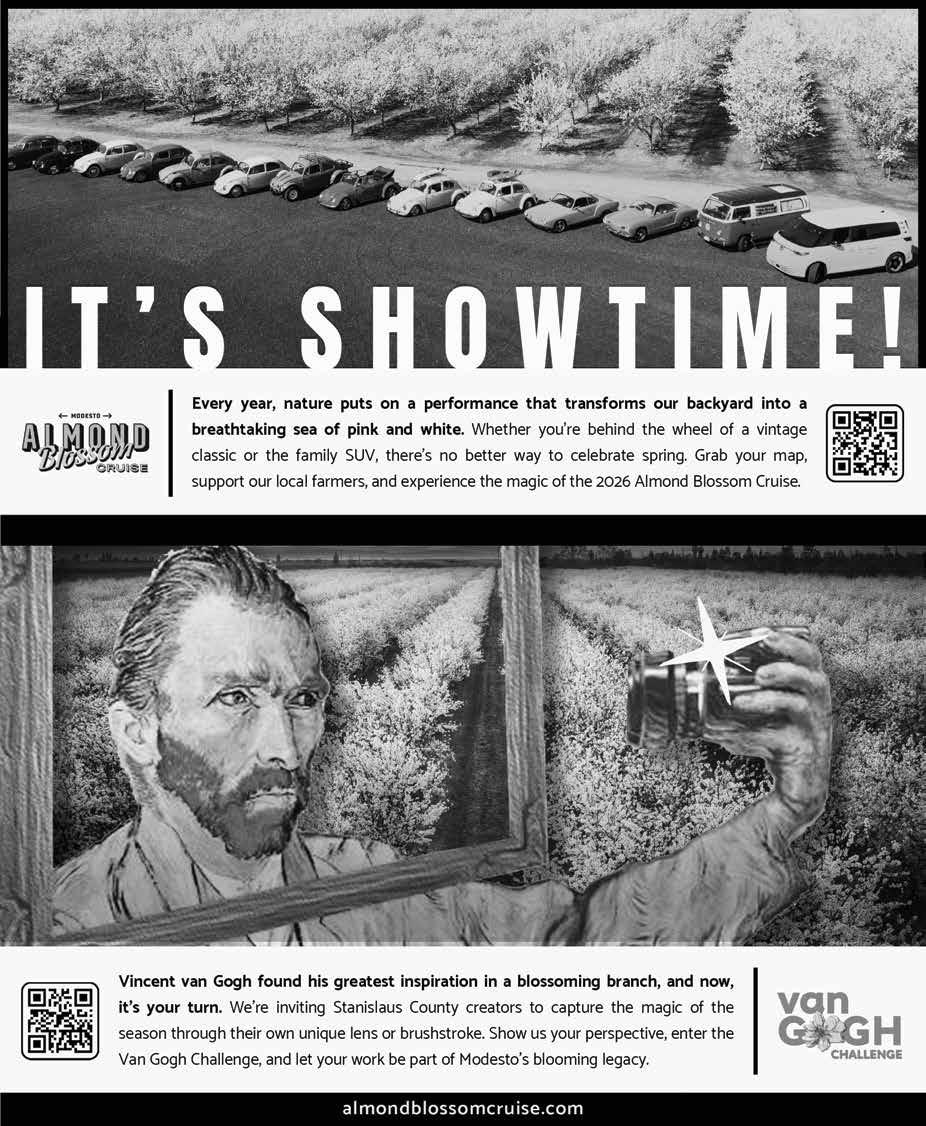 THE UNFILTERED VALENTINE’S ESCAPE. LOOKING FOR A CHANGE TO THE DINNER RUSH AND ROSES? THIS FEBRUARY, GIVE A GIFT THAT ACTUALLY BREATHES...THE ALMOND BLOSSOM CRUISE. IT’S A FOUR-HOUR SCENIC ESCAPE THROUGH STANISLAUS COUNTY’S STUNNING PINK AND WHITE HEARTLAND. WHETHER FOR YOUR VALENTINE OR YOURSELF, THE VISUAL POWER OF THESE ORCHARDS IN PEAK BLOOM IS A FLEETING, FESTIVE MIRACLE. IT’S THE PERFECT, STRESS-FREE DATE WITH ZERO HASSLE AND INFINITE PHOTO OPS. SCAN THE QR CODE TO ENTER OUR CONTEST FOR THE AUDIOBOOK HEAR REAL LOCAL STORIES AND DISCOVER WHY THIS REGION PRODUCES 80% OF THE WORLD’S ALMONDS. DON’T JUST DRIVE; EXPERIENCE THE SOUL OF MODESTO. STOP AND SEE THE BLOSSOMS.