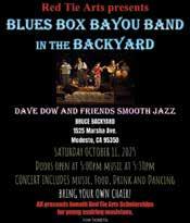 Join Red Tie Arts for a Great Night of The Blues Box Bayou Band, playing Cajon and Zydeco music with dancing, food and drink included. Dave Dow and Friends Smooth Jazz will open in the Bruce Backyard 1525 Marsha Ave. Red Beans and Rice with Chicken and drink for dinner. Saturday October 11, 2025. Doors open at 5pm. Red Tie Arts Kids at 5:30pm. Dave Dow and Friends 6:00pm-7:00pm, dinner 7:00pm7:30pm The Blues Bayou Band 7:30pm9:30pm. You are supporting music scholarships for individual music lessons provided to deserving young music students. Please come a support live music for a great cause in a beautiful setting. Please share with your friends!