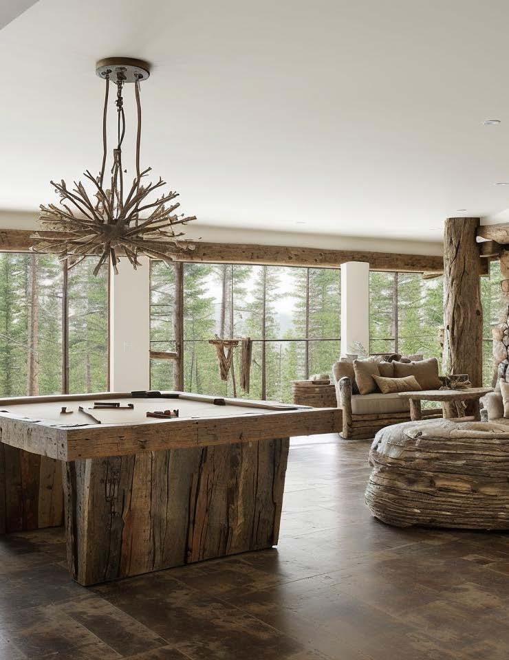 Tucked into the heart of the home, the game lounge offers a playful reprieve from the home’s more formal spaces. The flooring transitions here to a slightly darker oak in a herringbone pattern, providing a subtle sense of distinction. Overhead, twin starburst chandeliers with antique brass finishes add an element of mid-century glamour, casting soft reflections across the room.