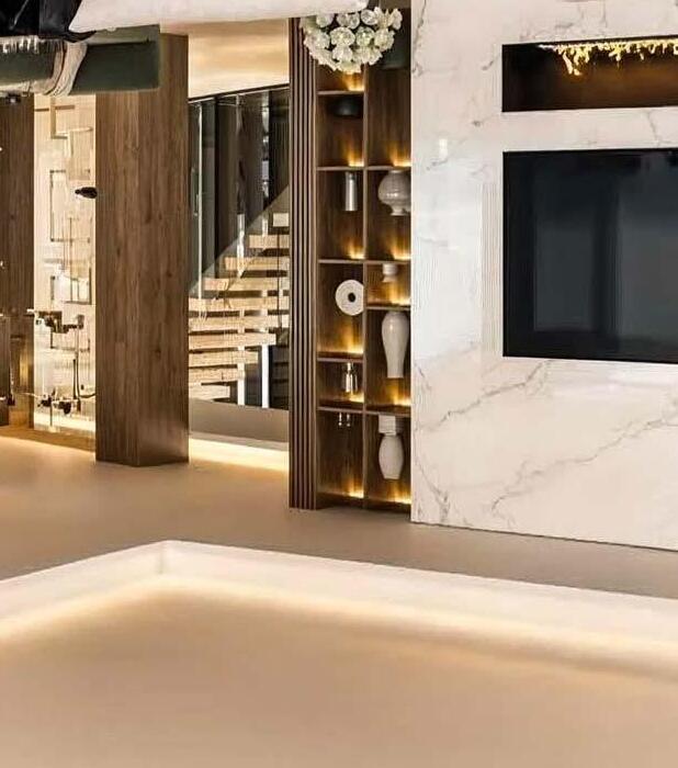 The walls are adorned with slabs of polished marble, each one carefully book-matched to create a seamless flow of veining. In contrast, plush, curved sofas in muted tones add a sense of warmth to the otherwise sleek aesthetic. A circular coffee table made from reclaimed oak sits in the center, grounding the space with its natural texture.