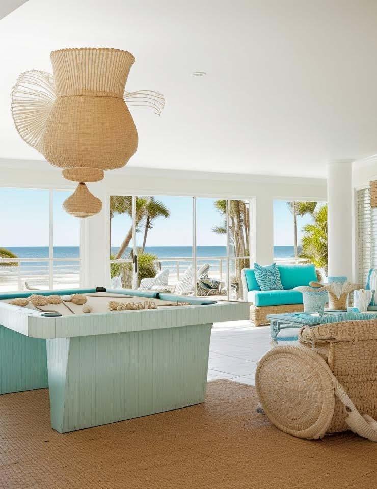 A custom-designed billiards table, finished in a matte sandstone hue, commands attention at the center. Its sleek silhouette echoes the home’s overarching minimalist ethos, while the deep blue felt surface introduces a note of vibrancy. Floor-to-ceiling windows line one side of the space, offering panoramic views of the coastline and flooding the room with natural light — a feature not commonly found in game rooms.